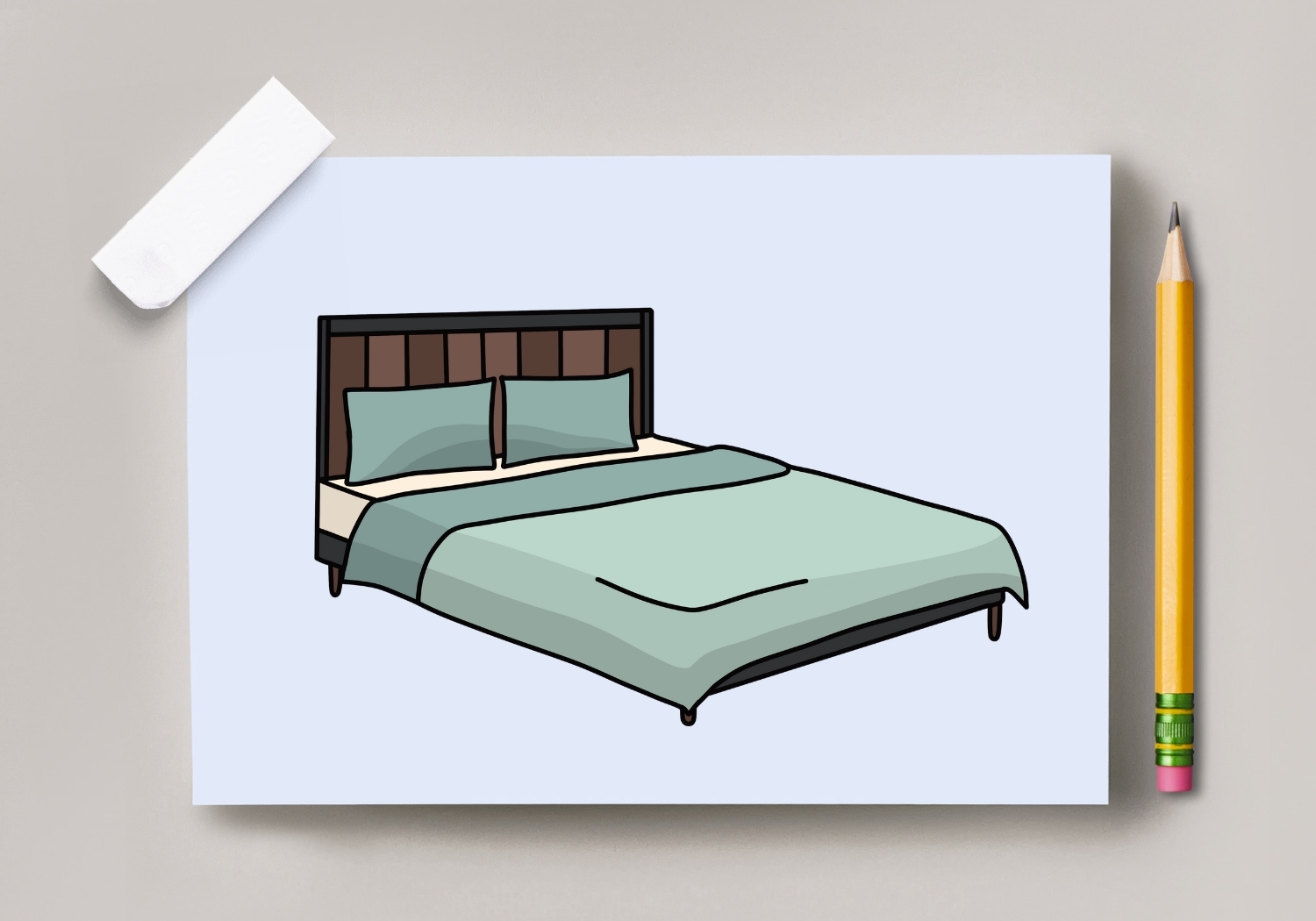 Start by sketching the rectangular frame of the bed. Use light, straight lines to create the outline of the bed, making sure to include the headboard and footboard. Next, add details such as the mattress and pillows. You can also add blankets or sheets to give your bed a cozy, lived-in look.