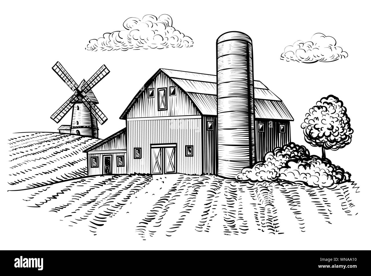 Rural Landscape Farm Barn And Windmill Sketch Hand Draw Illustration Of Countryside Natural Scenic Agricultural Farmhouse And Field Vector Monochrome Outline Image Stock Vector Image U0026 Art Alamy