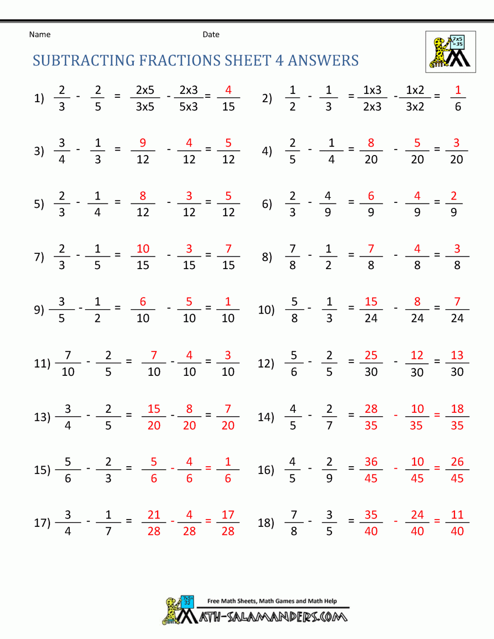 Subtracting Fractions Worksheets
