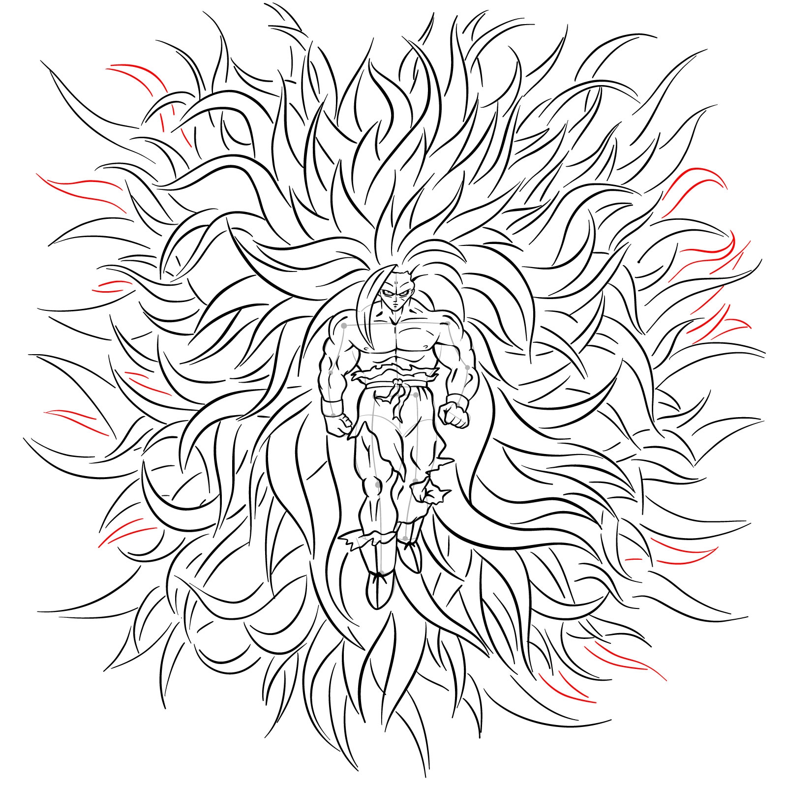 2. Next, add Goku’s body by drawing a broad chest and muscular arms. Remember to include his iconic orange gi and belt, as well as his wristbands and boots. Pay attention to the proportions and details to capture Goku’s powerful physique.
