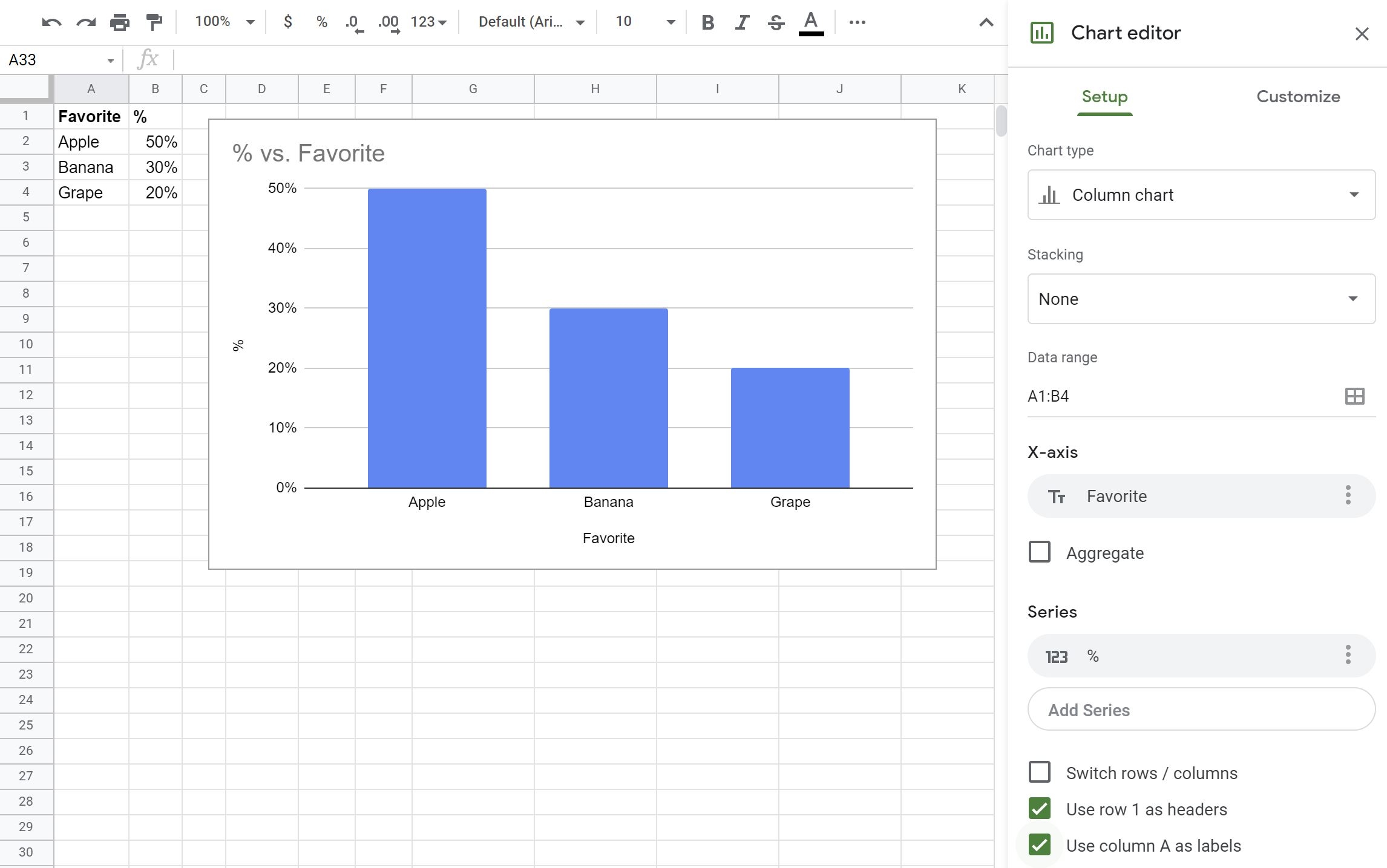 To add percentage values to a bar graph in Google Sheets, simply follow these steps: