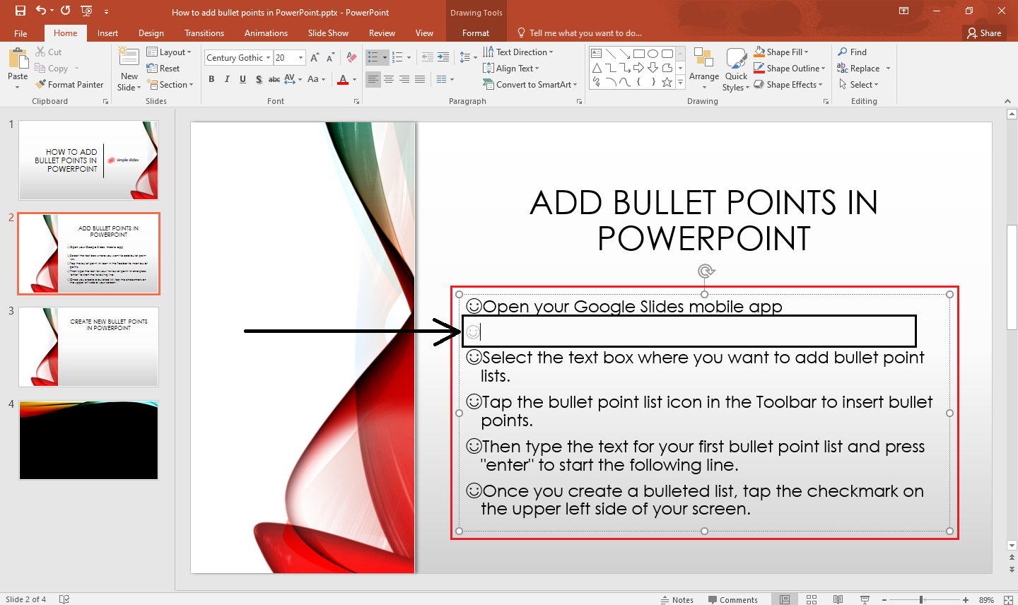 5. Once you have selected a bullet style, start typing your list. Each item you type will automatically be preceded by a bullet point.