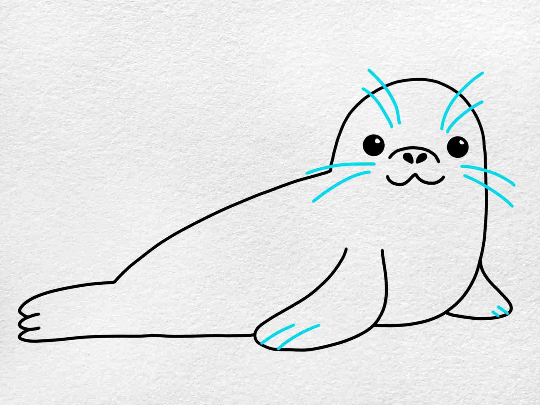 Next, add the flippers and tail to your seal drawing. Seals have short, stubby flippers that are perfect for swimming in the ocean. Draw two small ovals on each side of the body for the flippers, and a small, curved line at the back for the tail.