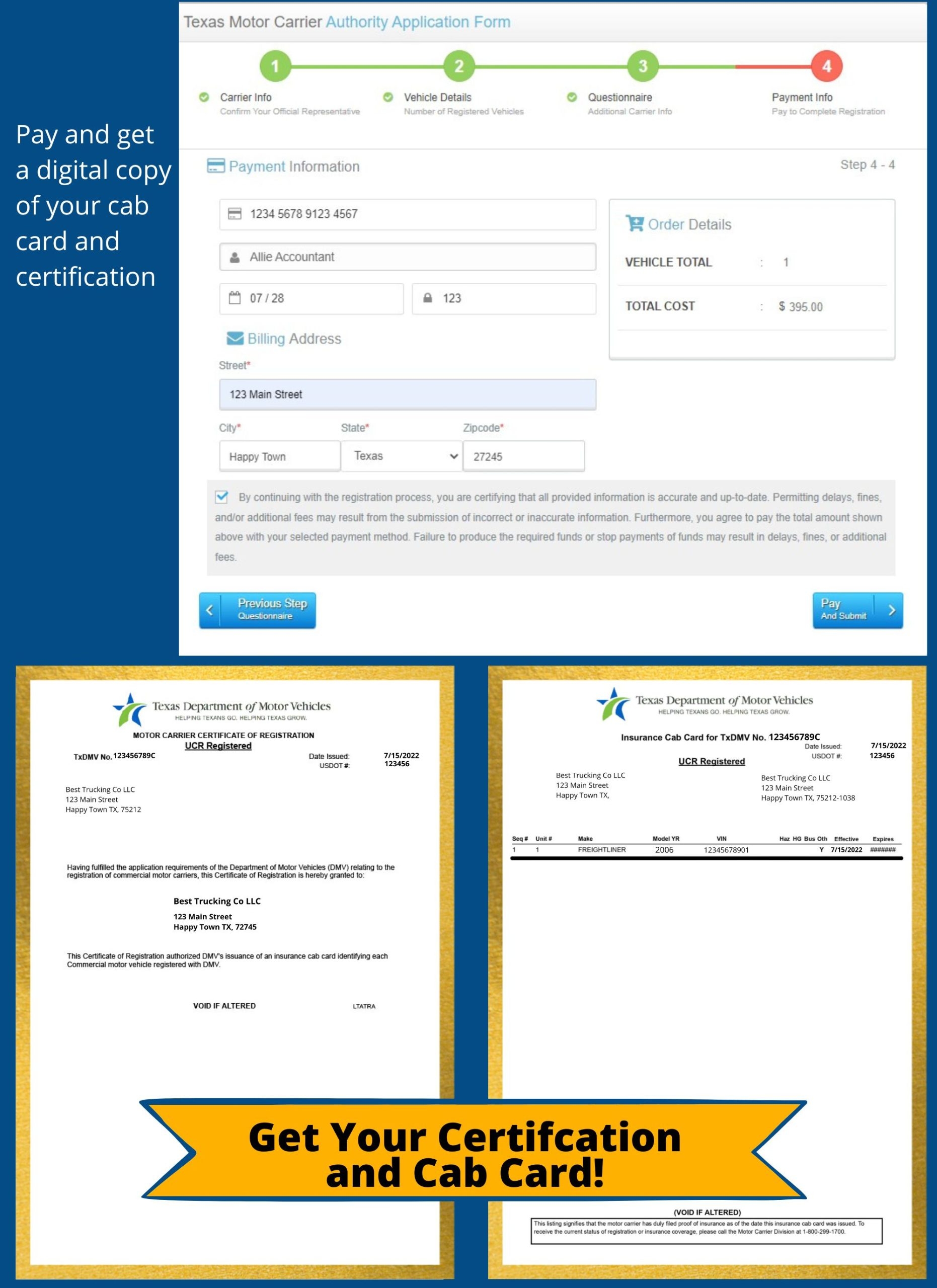 After you have submitted your application, you will need to pay a fee to obtain your DOT number. The fee for a DOT number in Texas is currently $300, and it must be paid online using a credit or debit card. Once your payment has been processed, you will receive your DOT number, which you will need to display on your vehicles and include on all of your business documents.