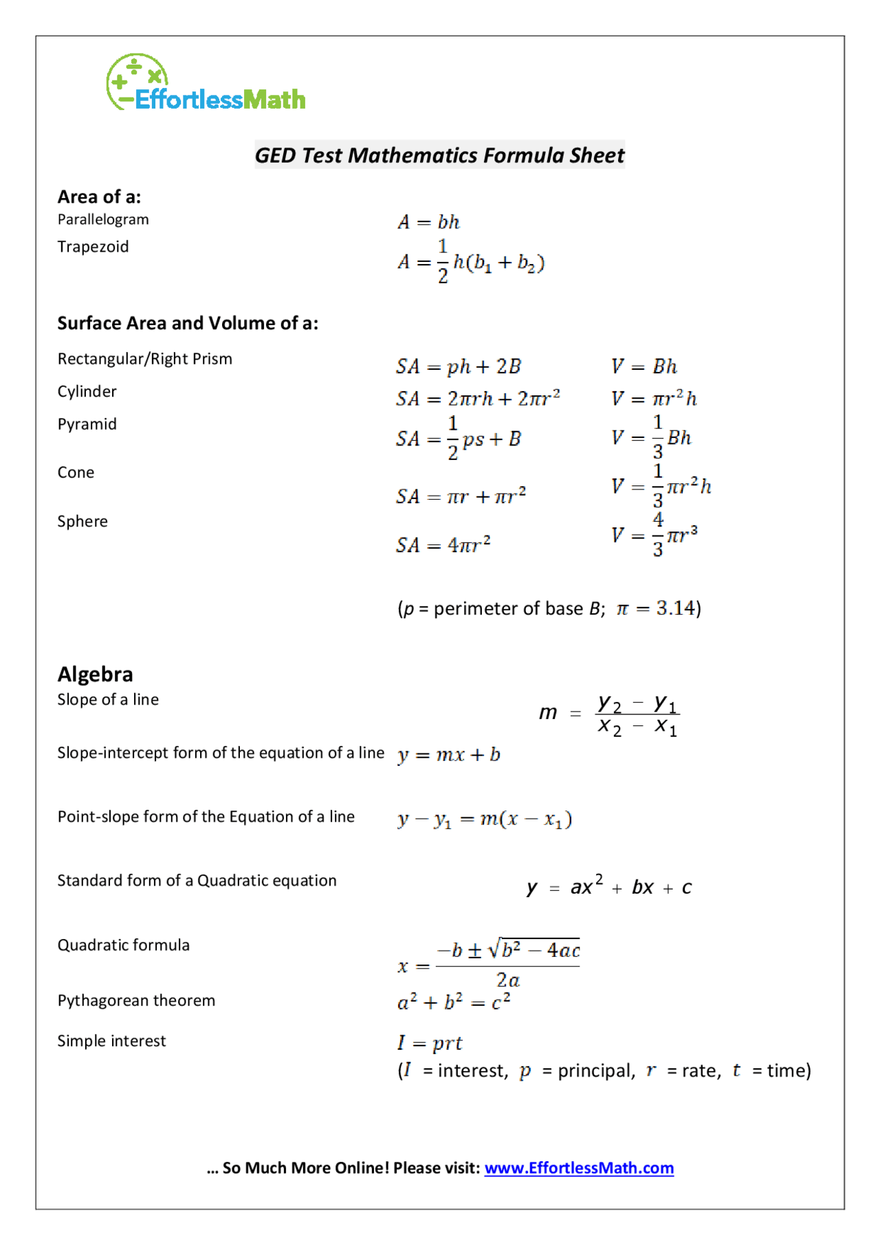 Math Ged Formula Sheet