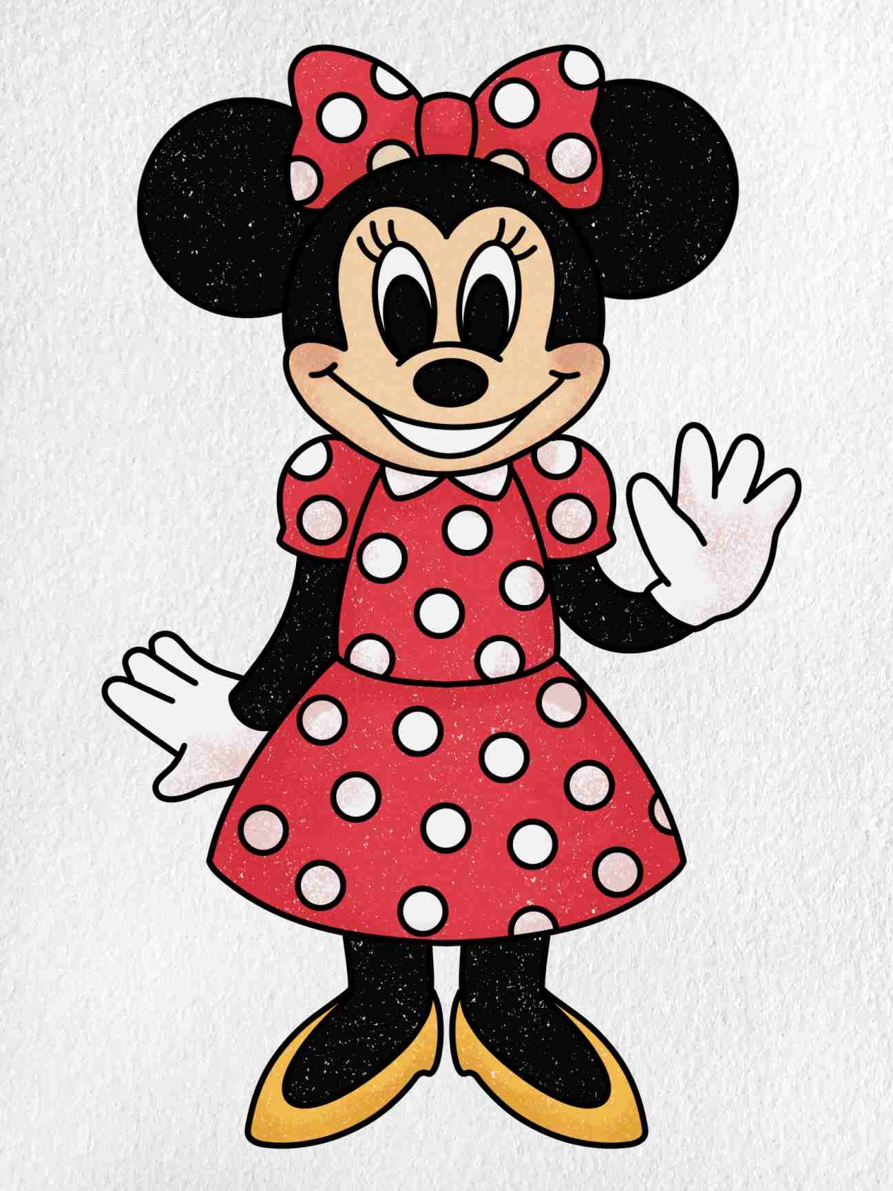 For the finishing touches, add in some color to make your Minnie Mouse drawing really pop. Use red for her dress, yellow for her shoes, and of course, plenty of black for her ears and gloves. Don’t forget to add in the white polka dots on her dress for that classic Minnie Mouse look. Once you’re happy with your drawing, you can even add in a background to really set the scene.