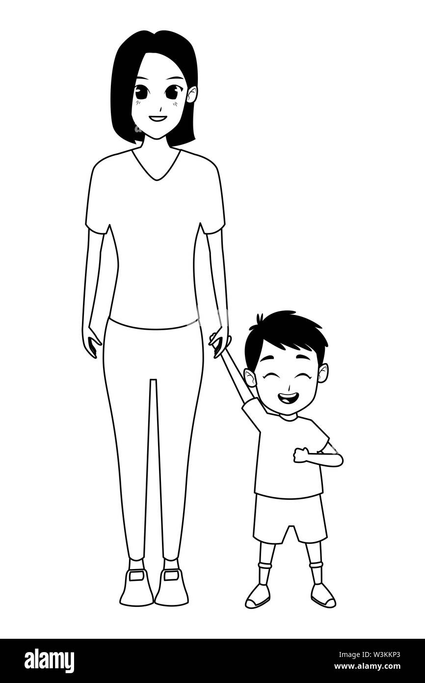 Family Single Mother With Children Cartoon In Black And White Stock Vector Image U0026 Art Alamy