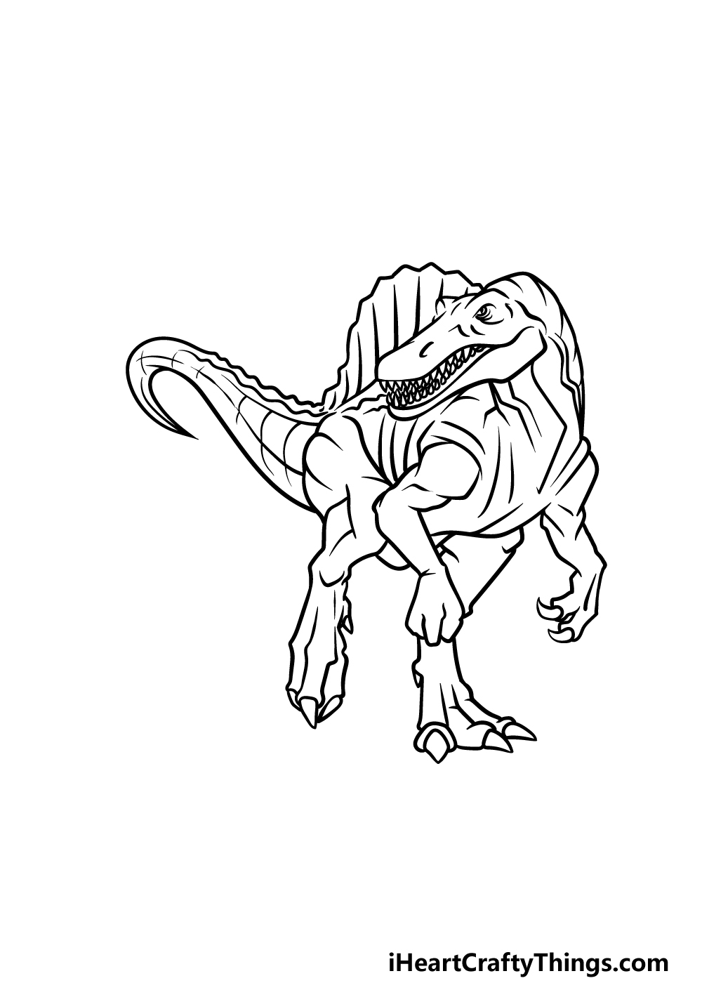 Begin by sketching the basic outline of Spinosaurus, paying close attention to its elongated body and powerful limbs. Add in the sail along its back, which is believed to have been used for display or thermoregulation, adding a unique and striking feature to the dinosaur’s appearance.